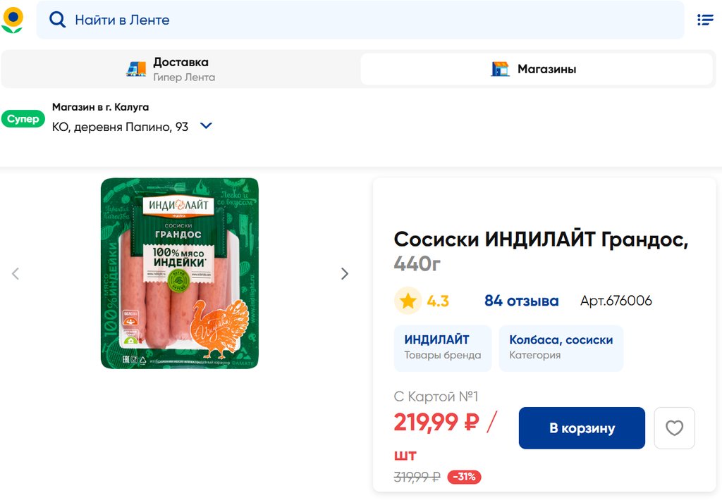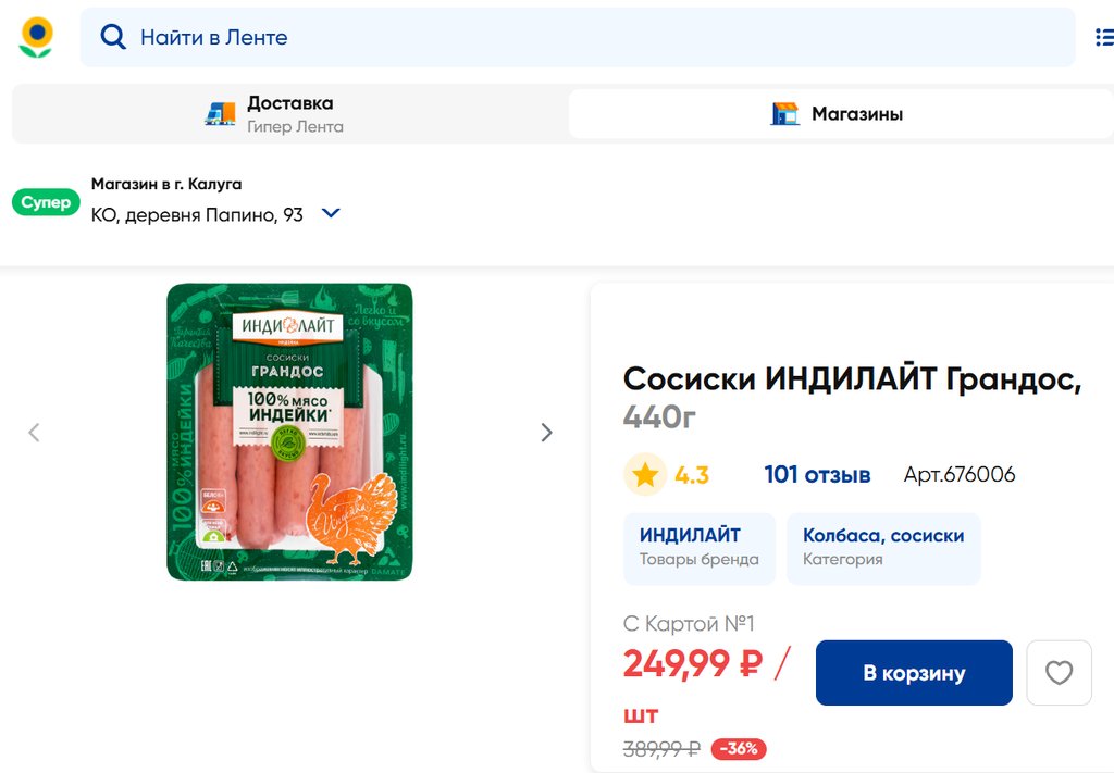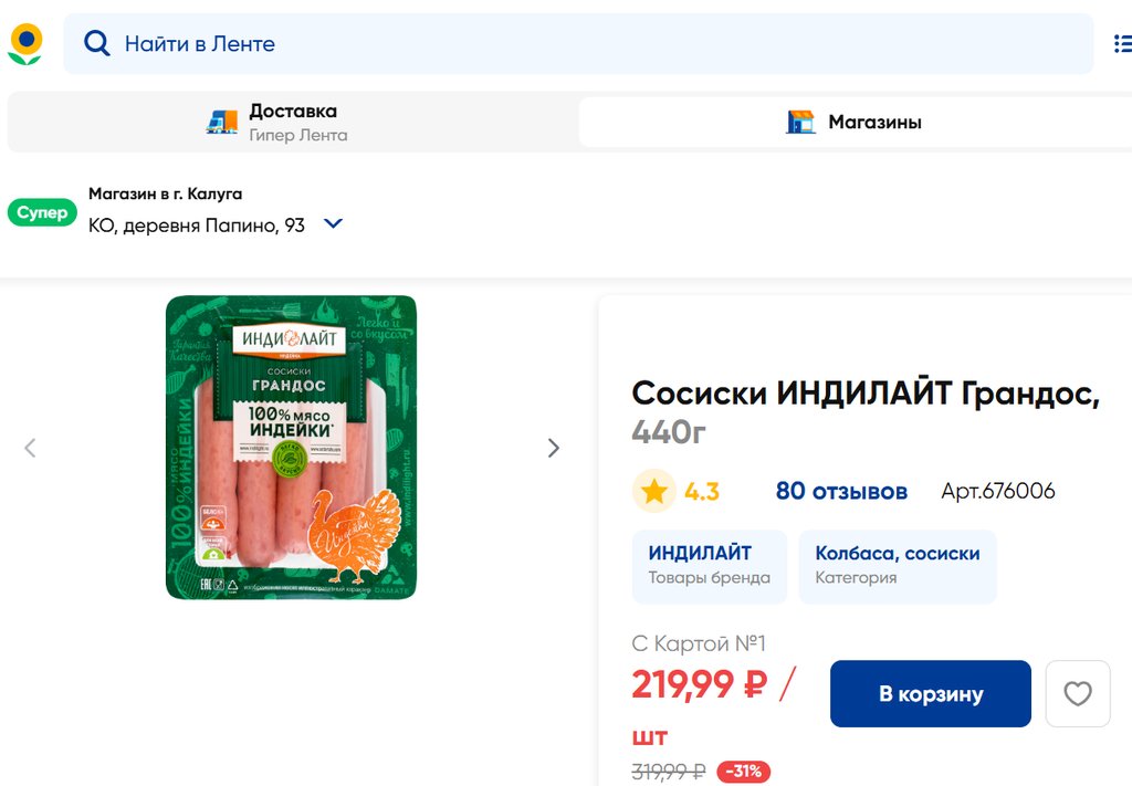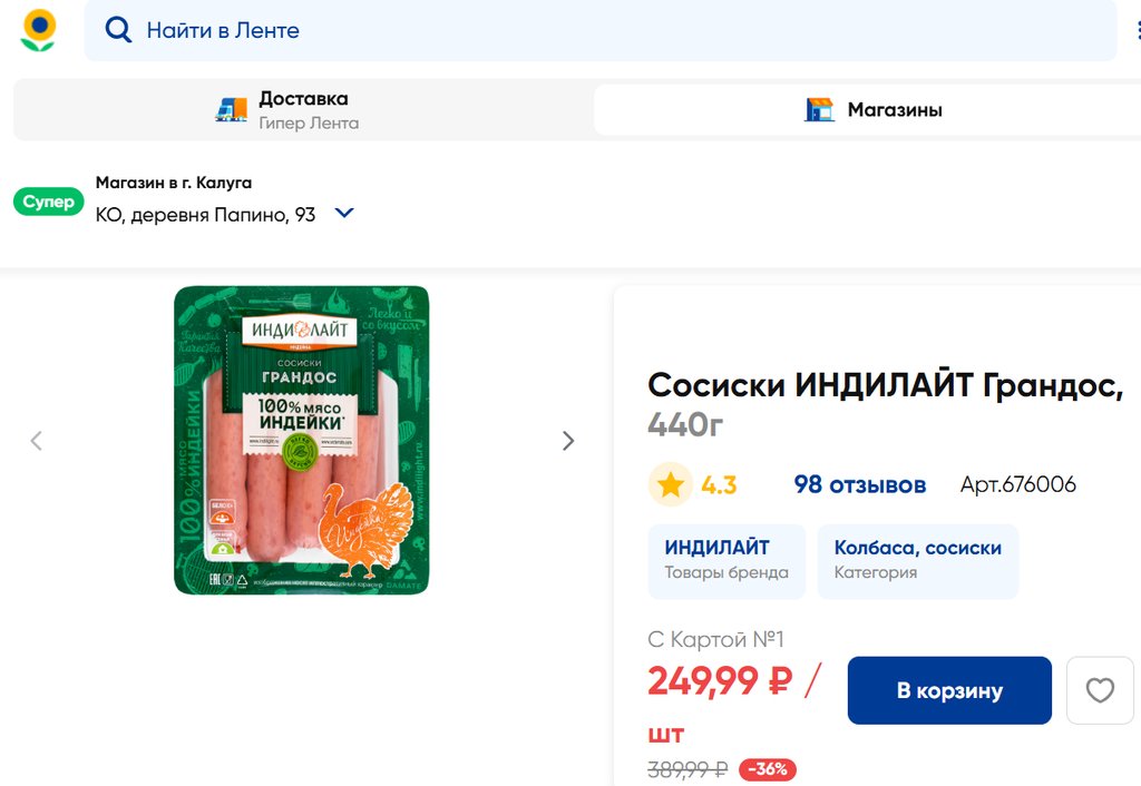 Сосиски ИндиЛайт Грандос вареные из мяса индейки 440г