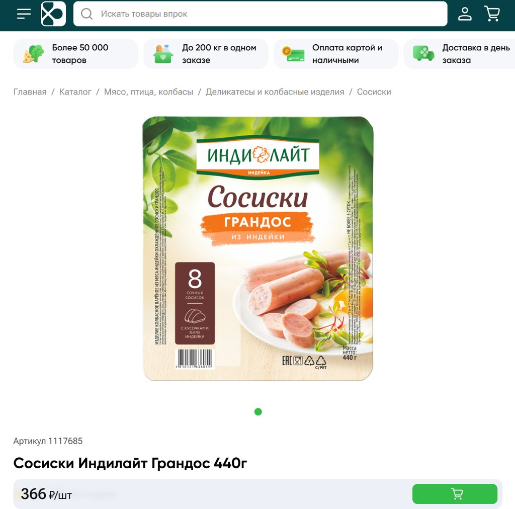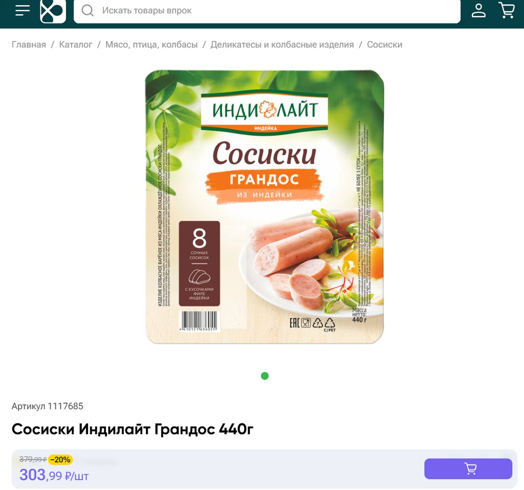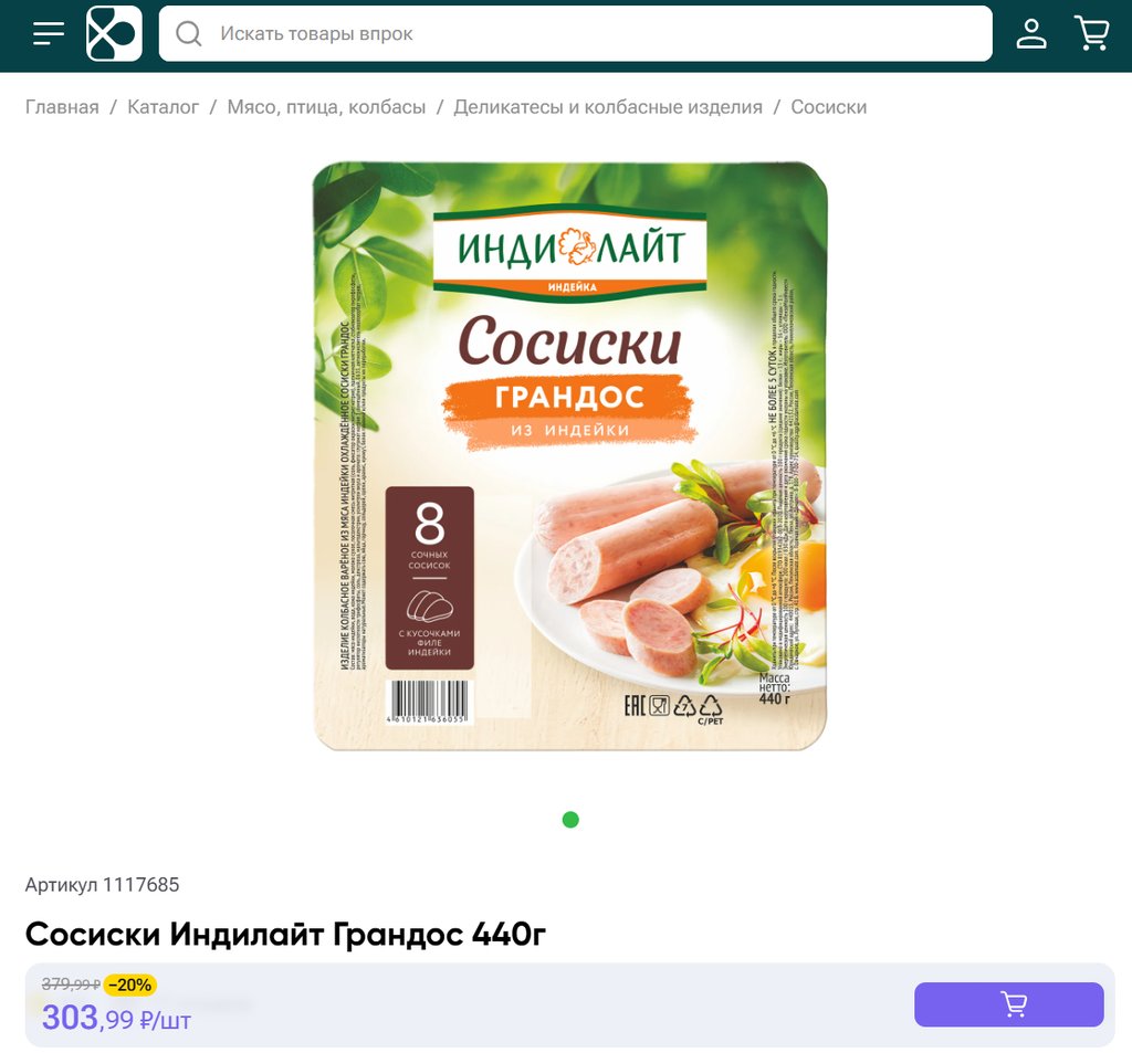 Сосиски ИндиЛайт Грандос вареные из мяса индейки 440г