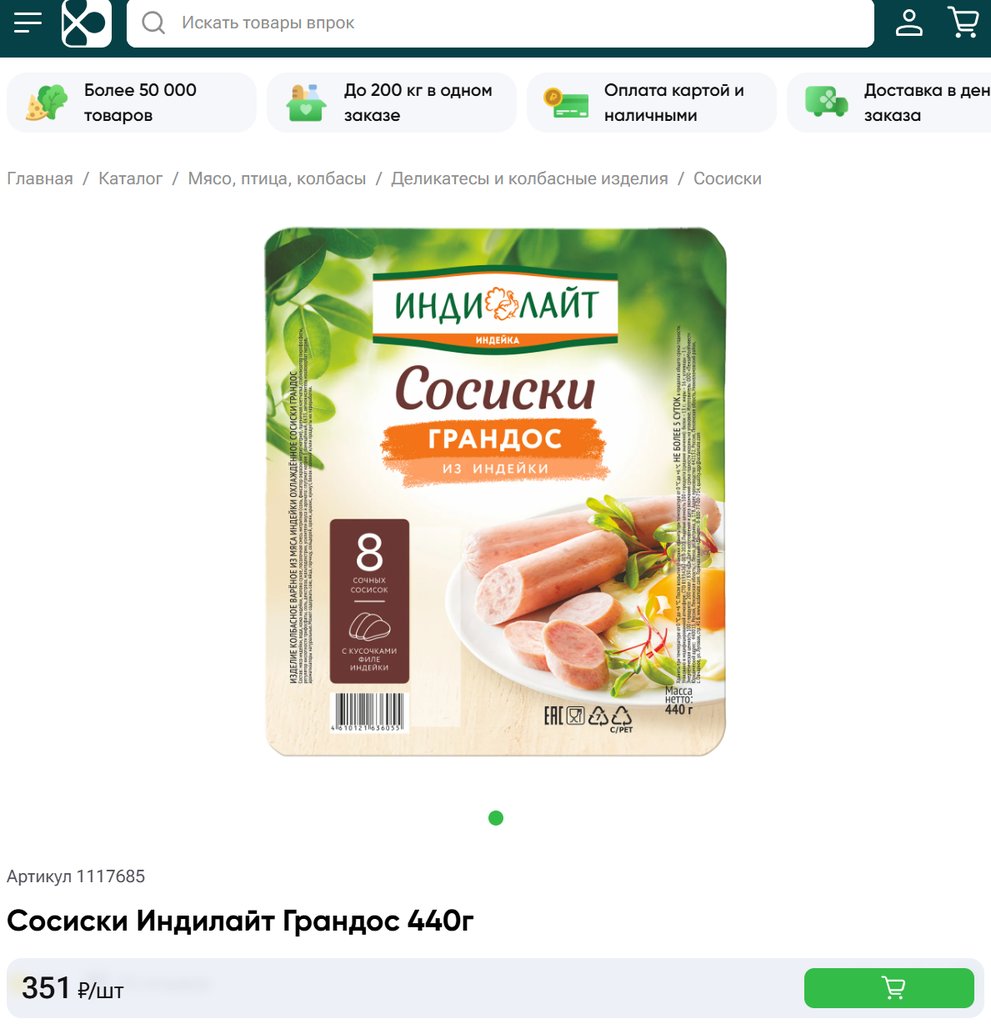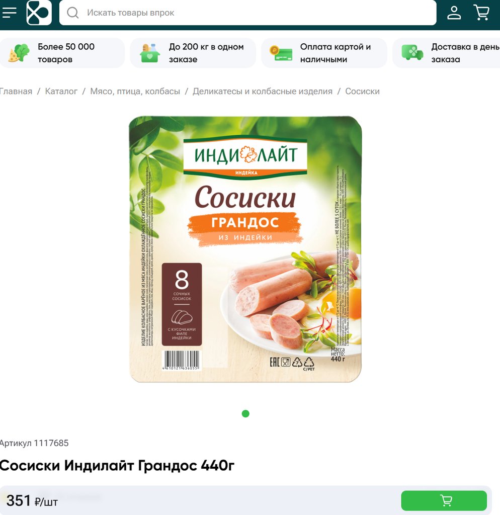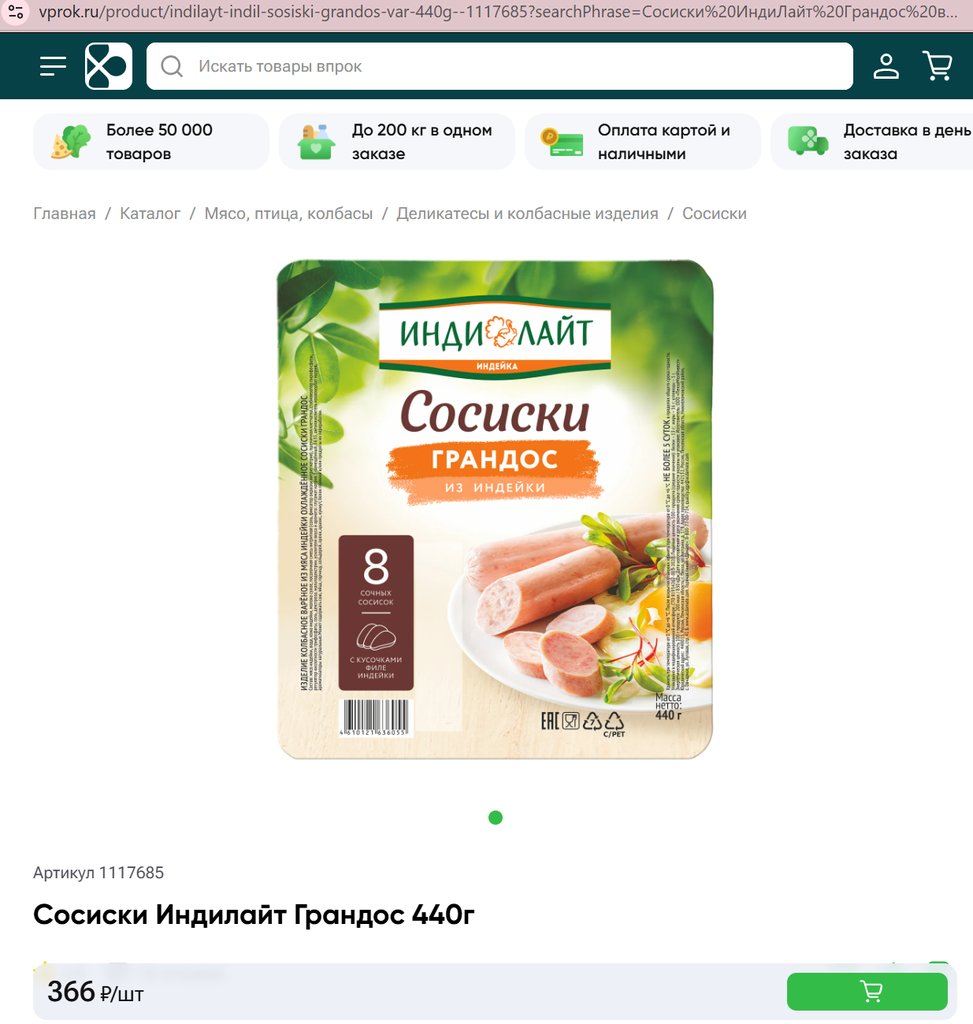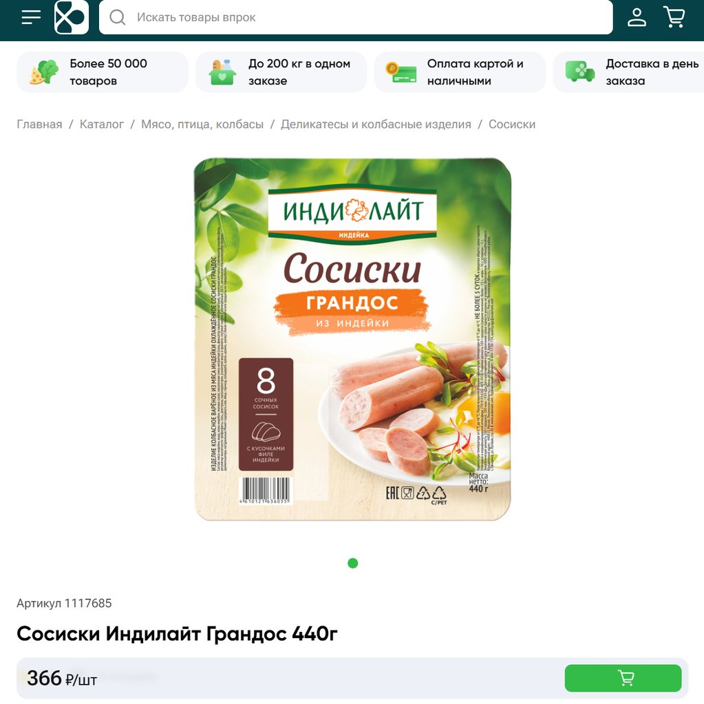 Сосиски ИндиЛайт Грандос вареные из мяса индейки 440г