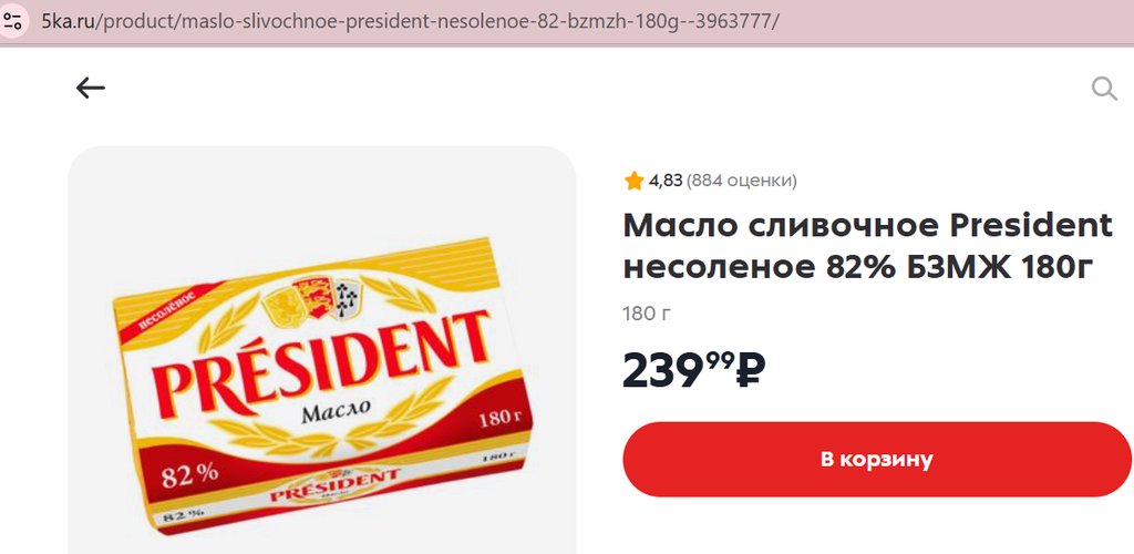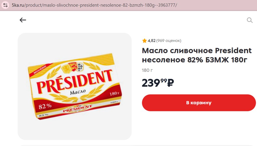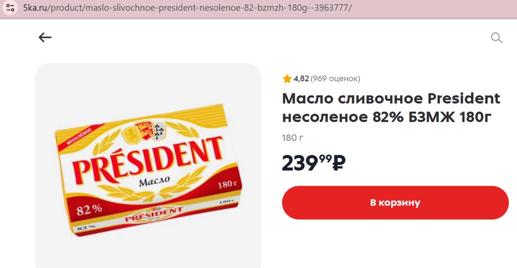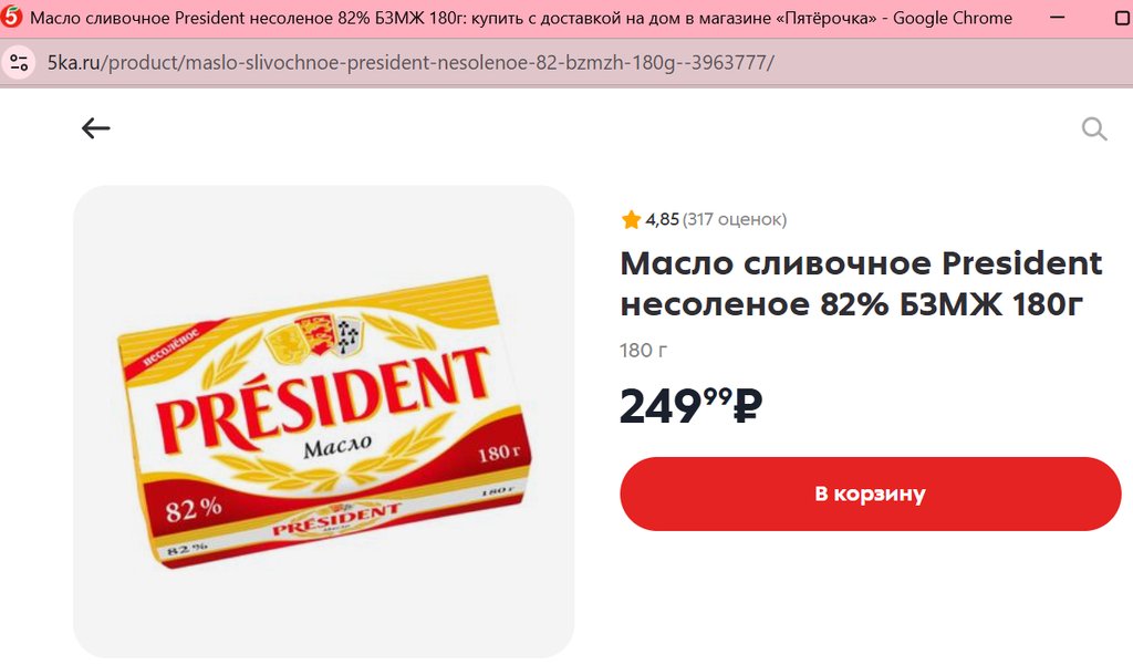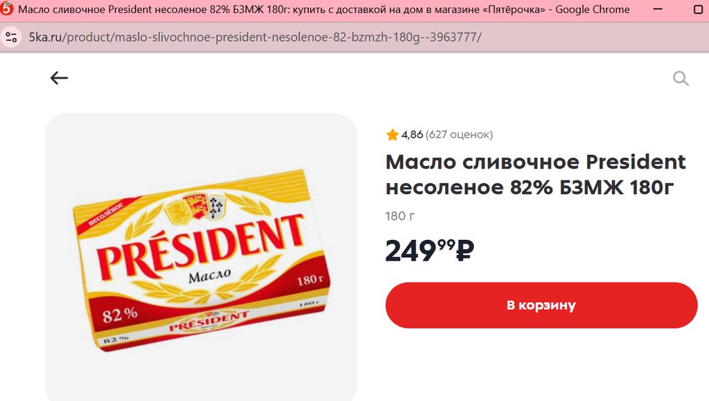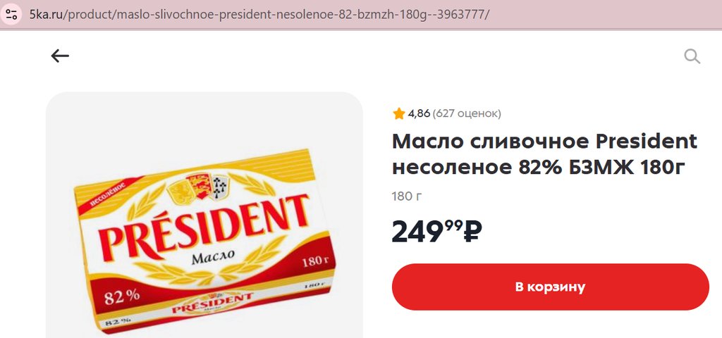 Масло President несоленое 82% 180г