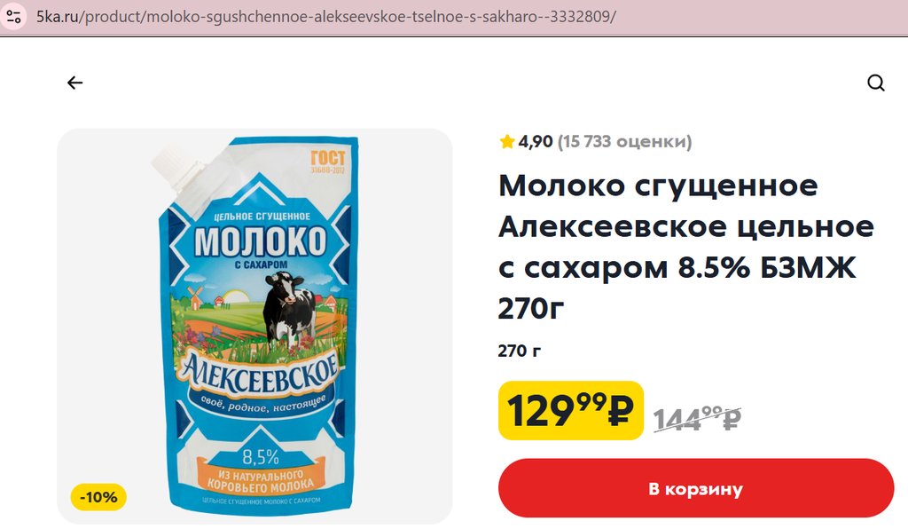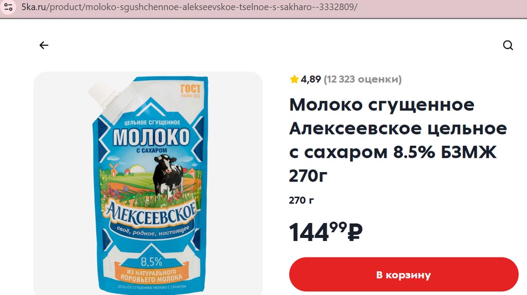 Молоко сгущенное Алексеевское цельное с сахаром 8.5% 270г
