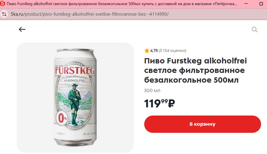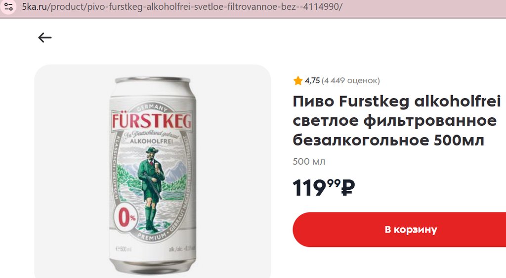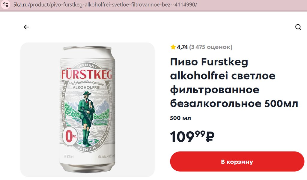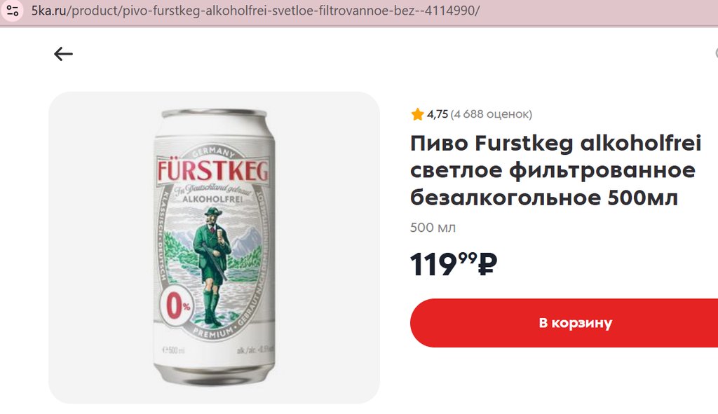 Пиво безалкогольное Furstkeg alkoholfrei светлое фильтрованное 500мл
