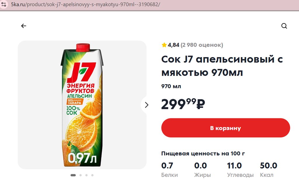 Сок J7 апельсиновый с мякотью 970мл