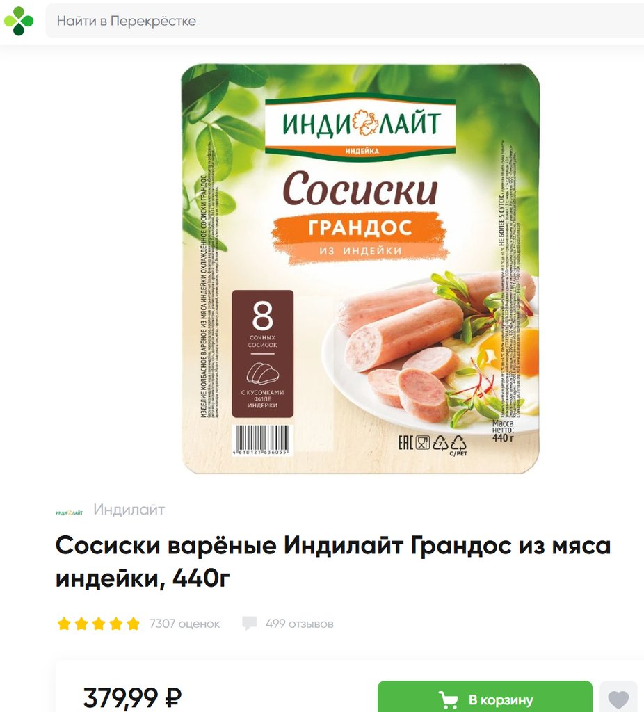 Сосиски ИндиЛайт Грандос вареные из мяса индейки 440г