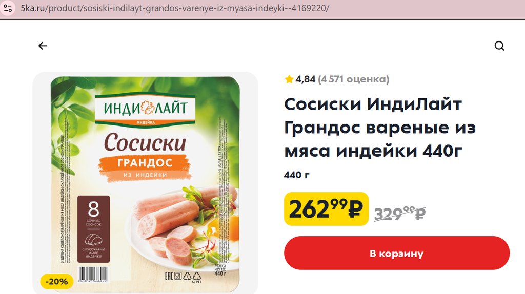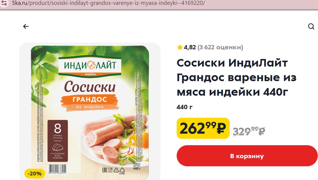 Сосиски ИндиЛайт Грандос вареные из мяса индейки 440г