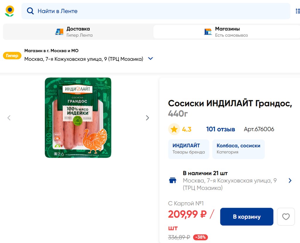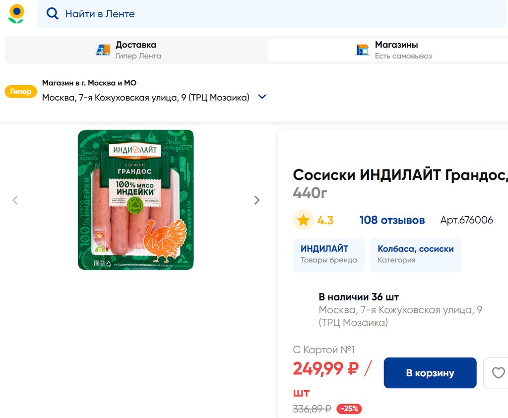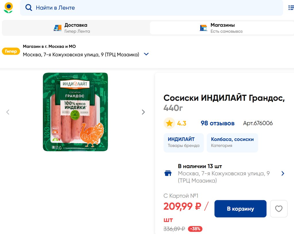 Сосиски ИндиЛайт Грандос вареные из мяса индейки 440г