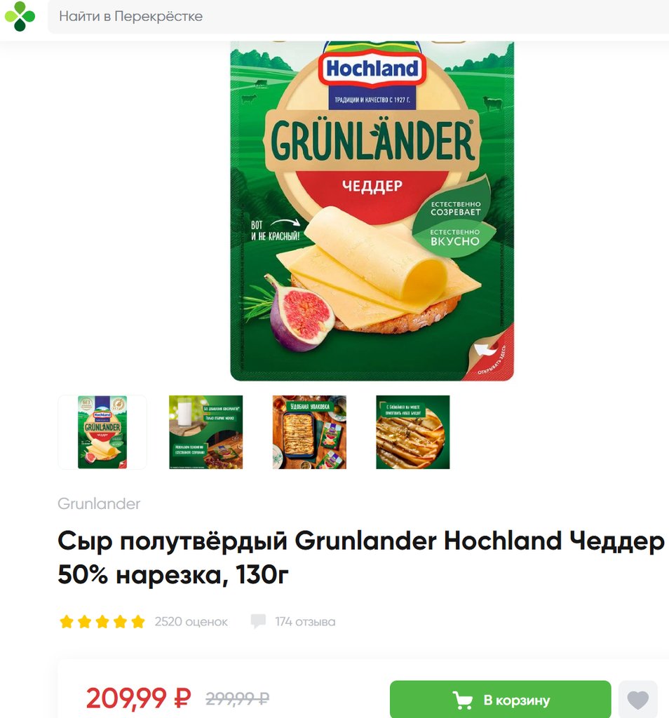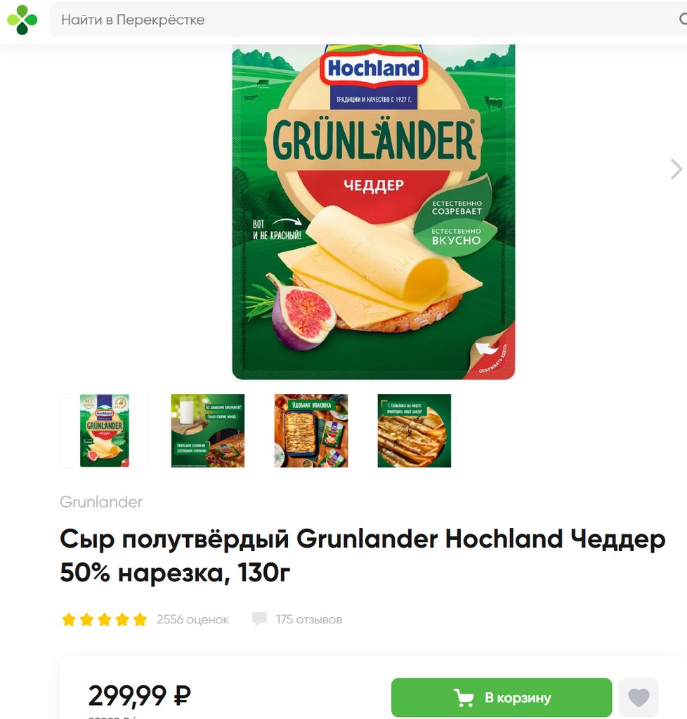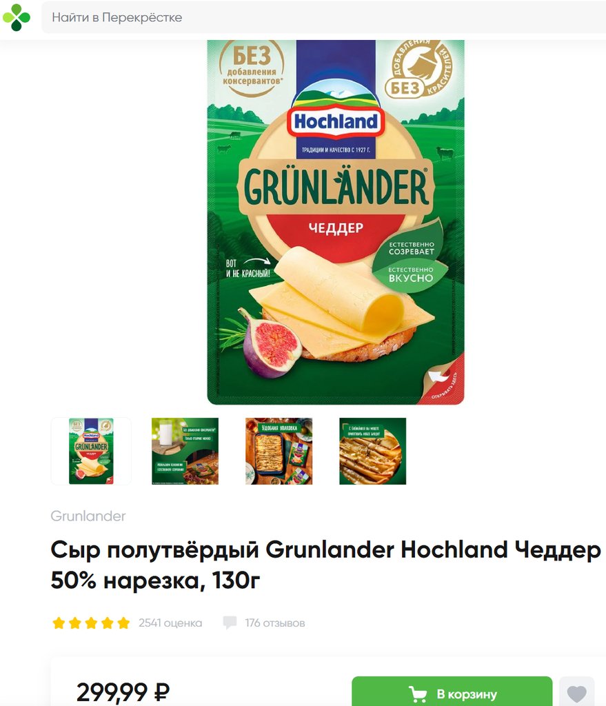 Сыр Grunlander Hochland Чеддер 50% нарезка, 130г