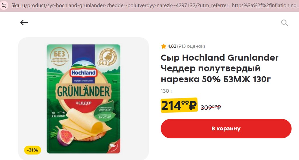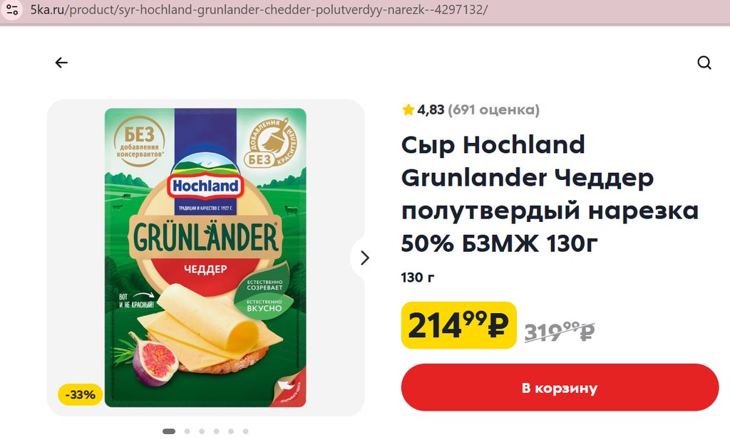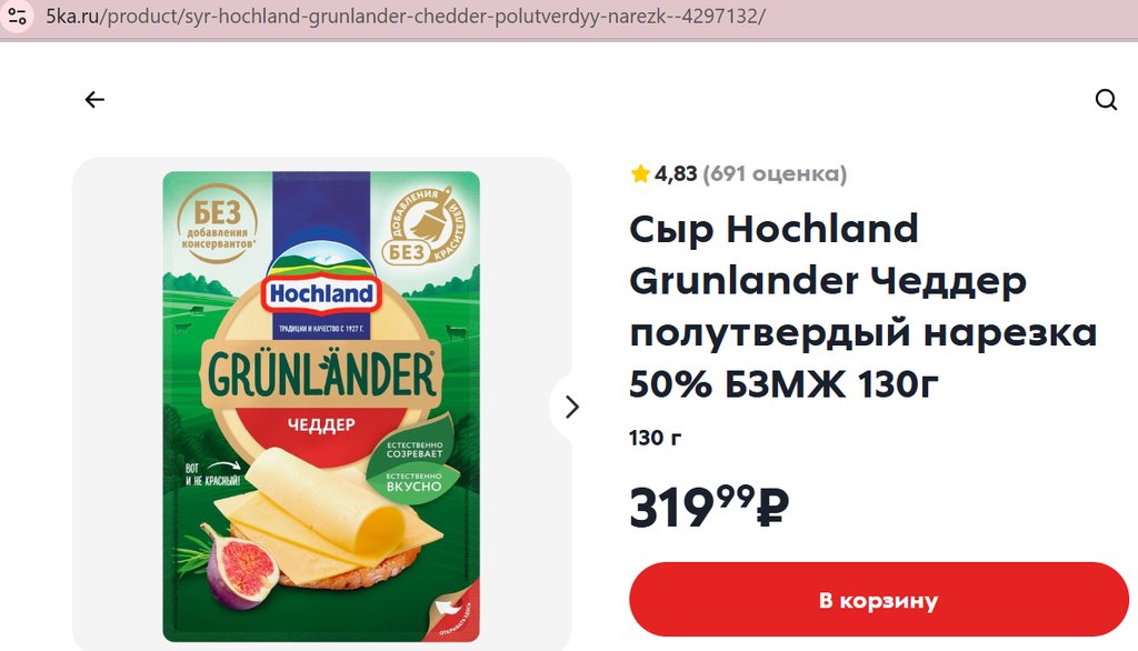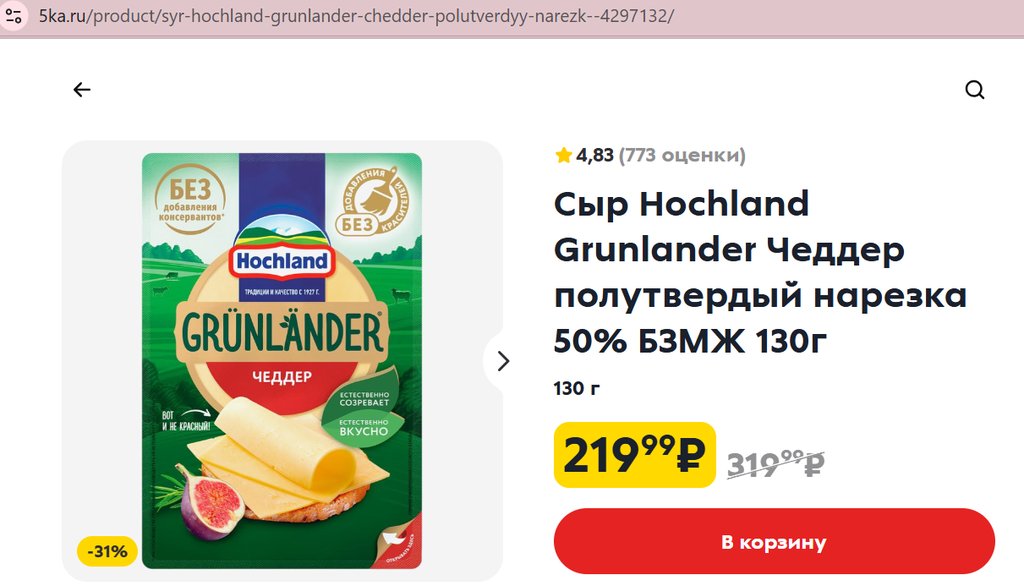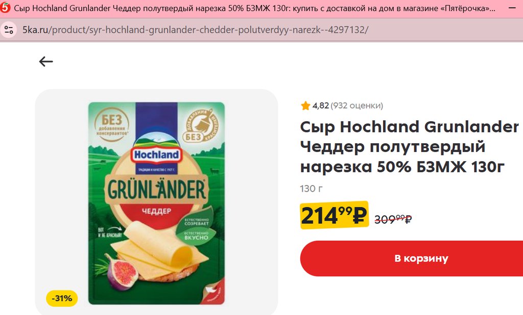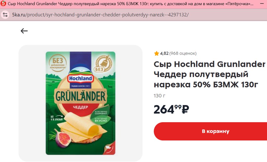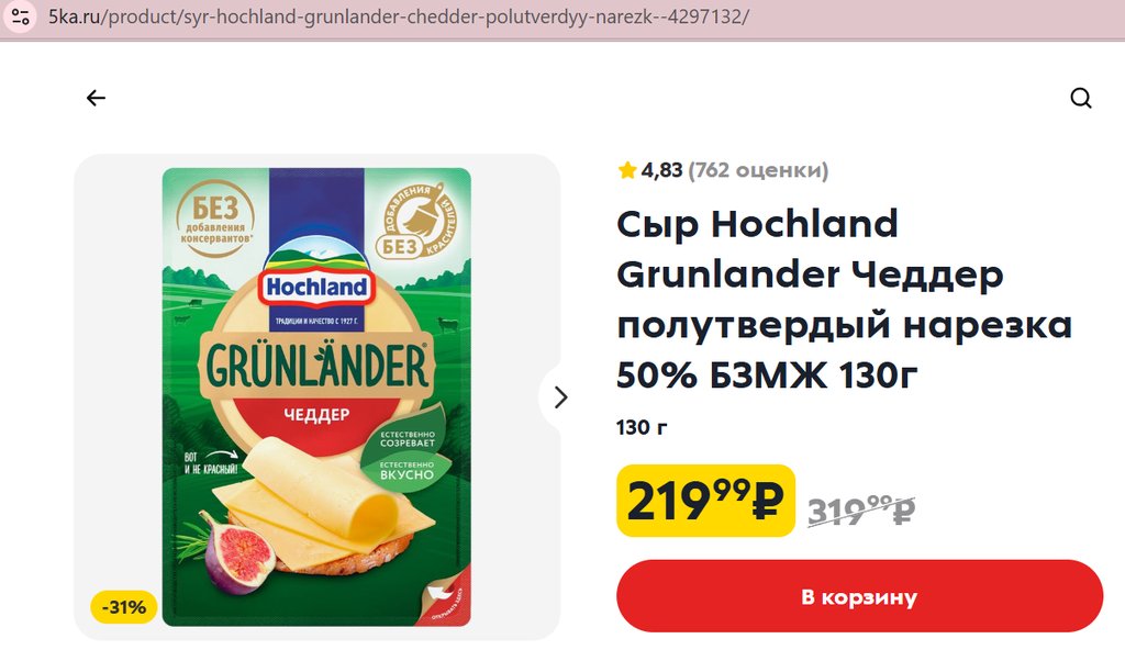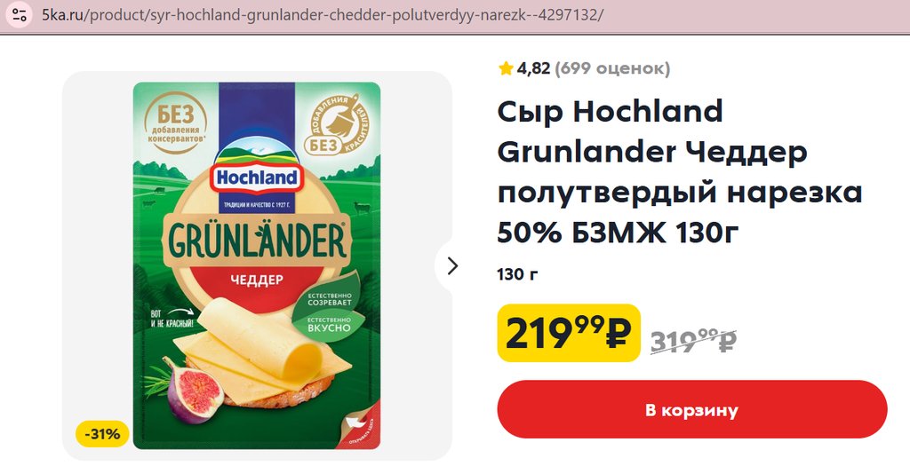 Сыр Grunlander Hochland Чеддер 50% нарезка, 130г