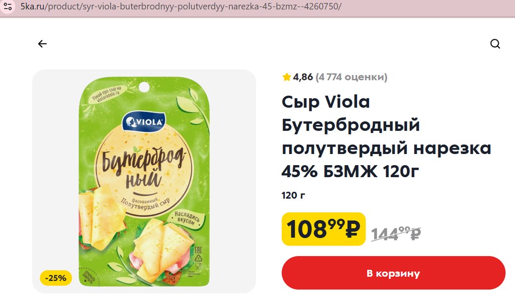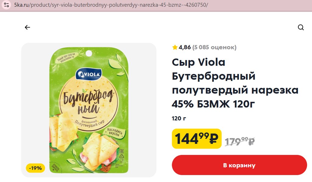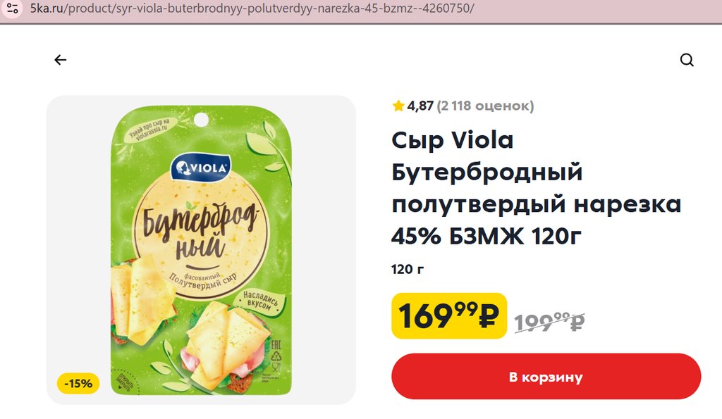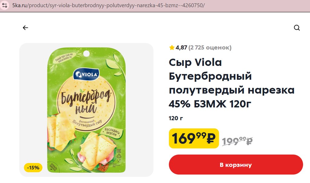 Сыр Viola полутвердый Бутербродный нарезка 45% 120г
