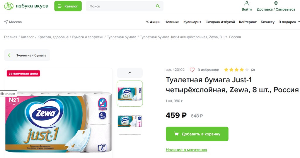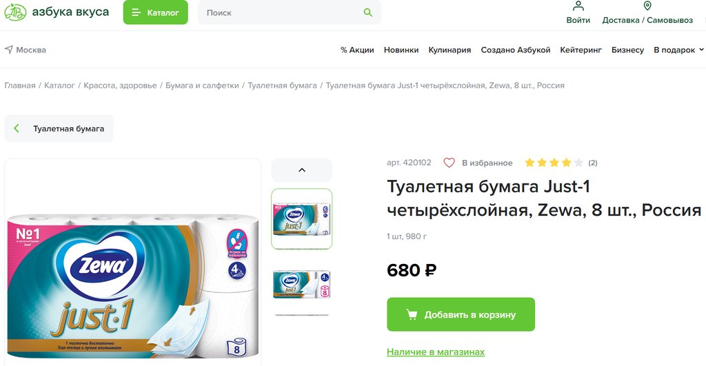 Туалетная бумага Zewa Just-1 8 рулонов 4 слоя