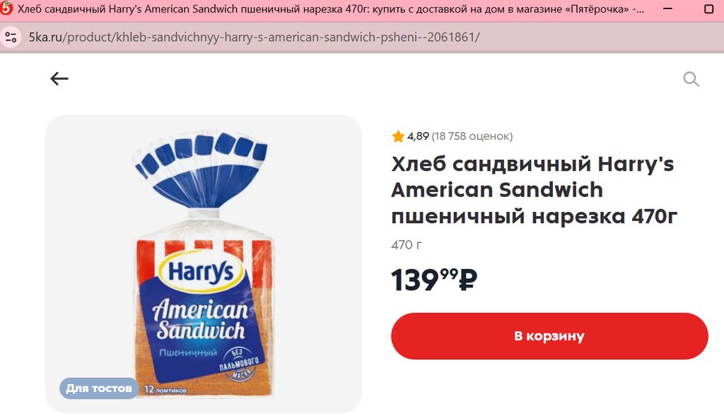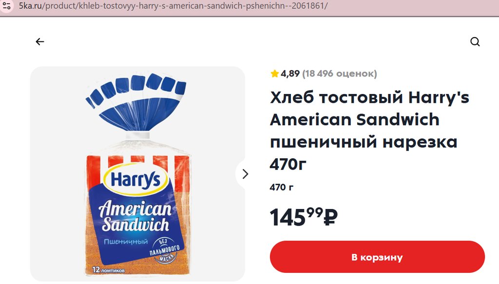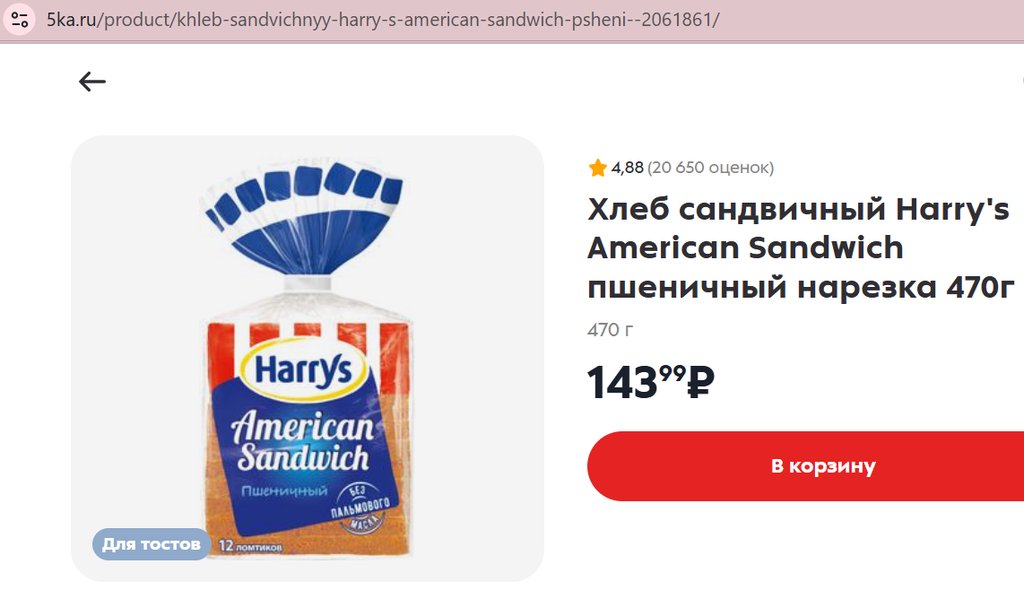 Хлеб Harrys American Sandwich пшеничный 470г