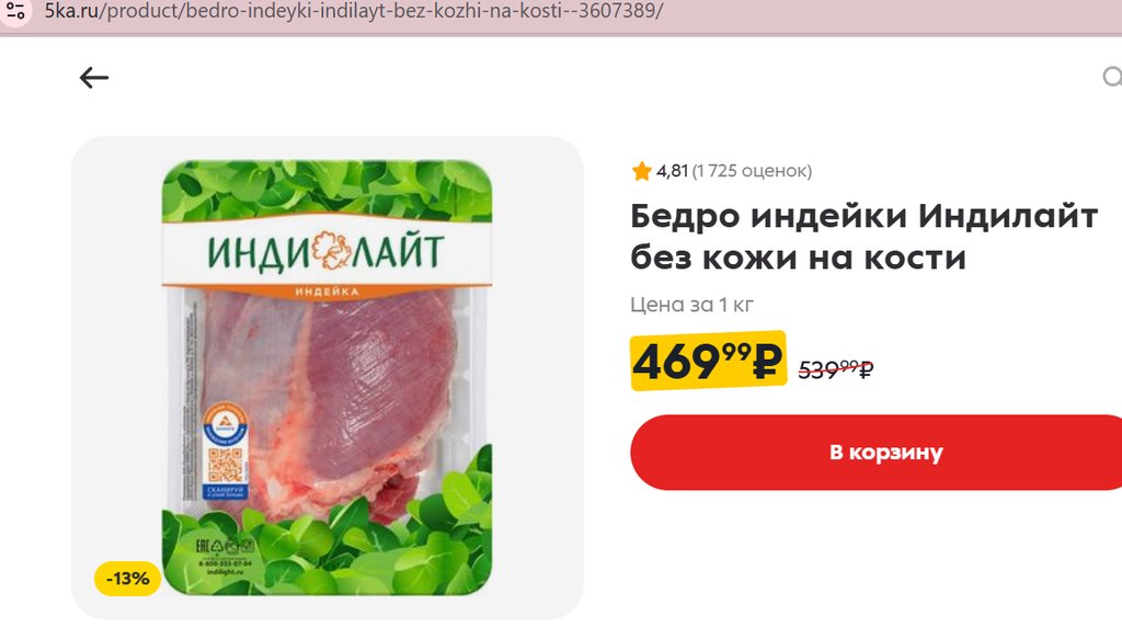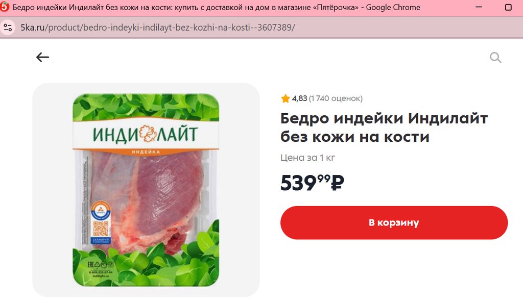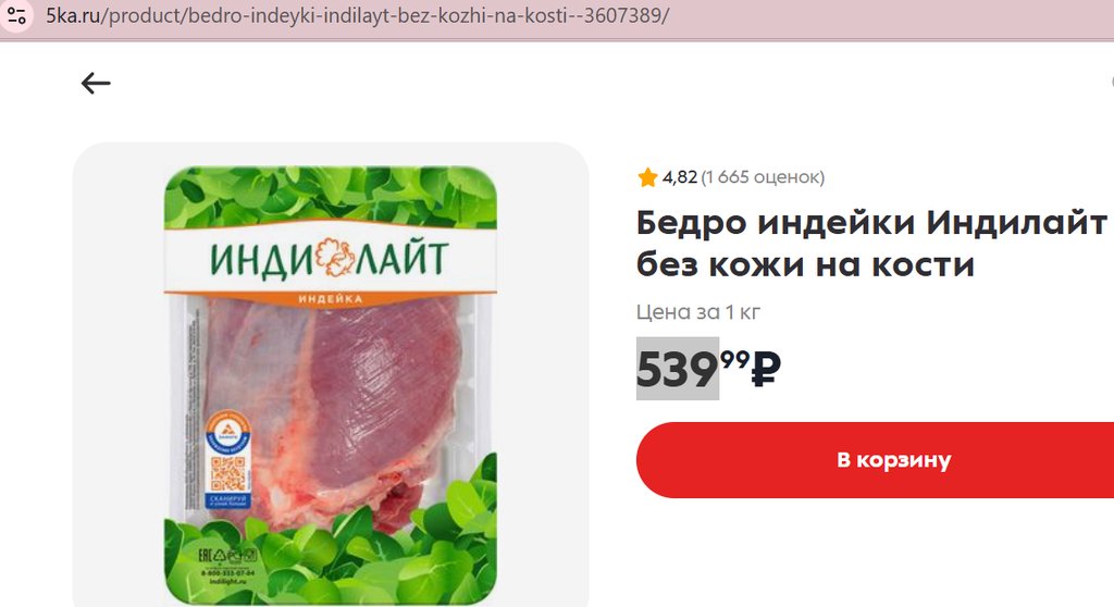 Бедро индейки Индилайт на кости без кожи 1кг.