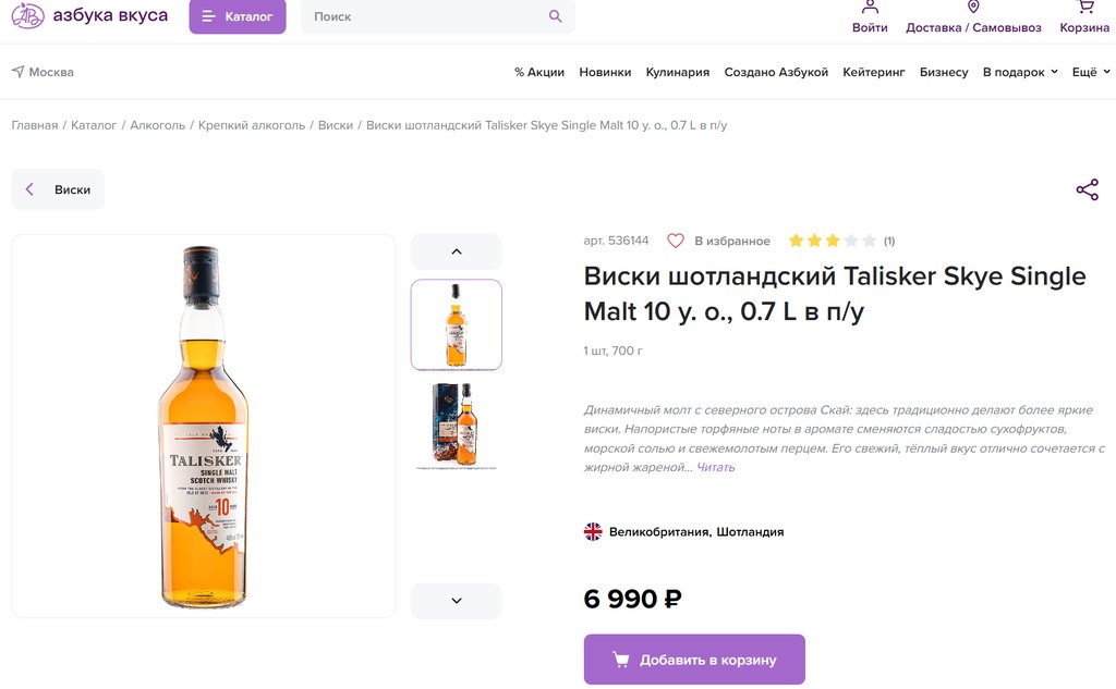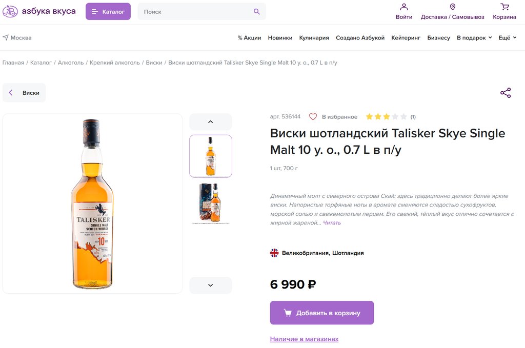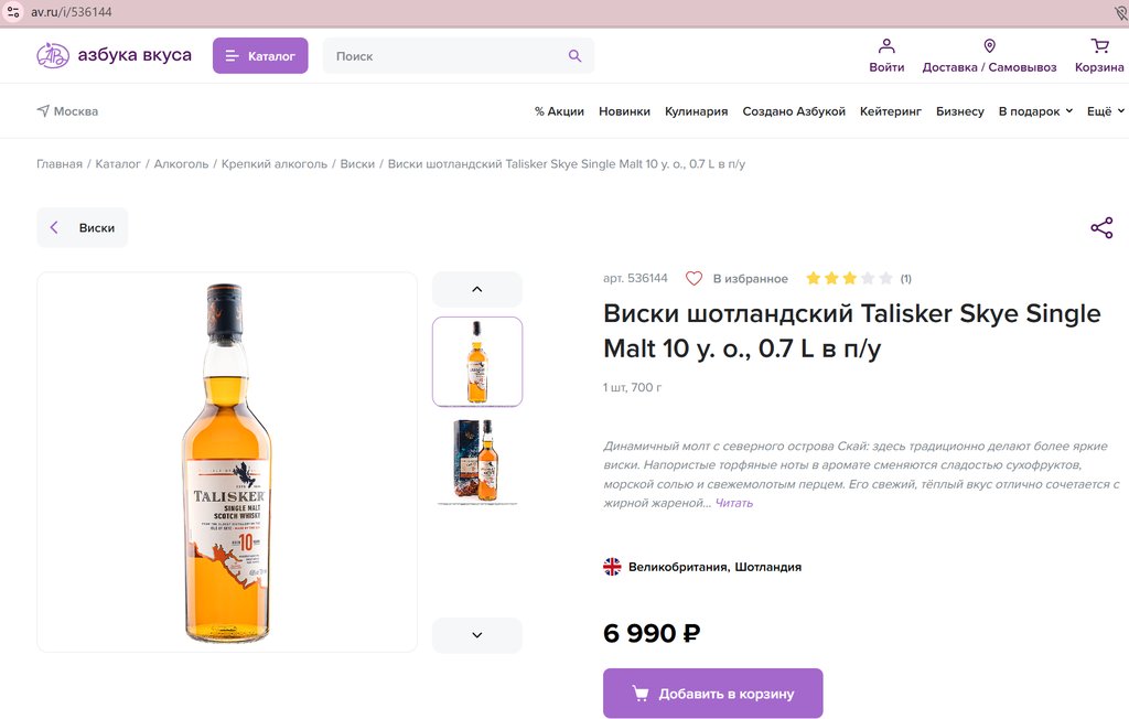 Виски шотландский Talisker Single Malt 10 y. o., 0.7