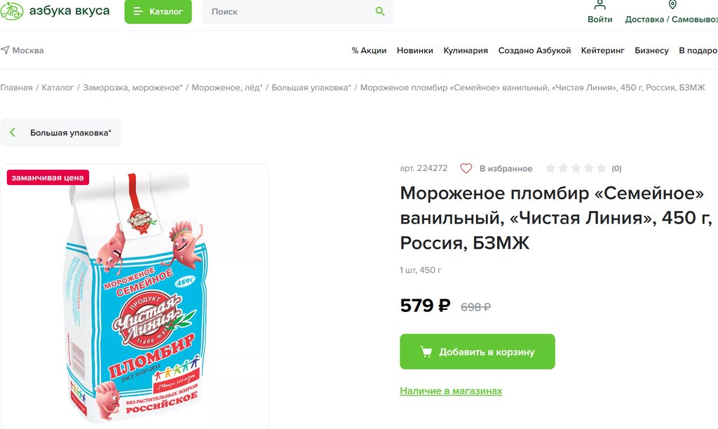 Мороженое Чистая Линия Семейное Пломбир Ванильный 12% 450г