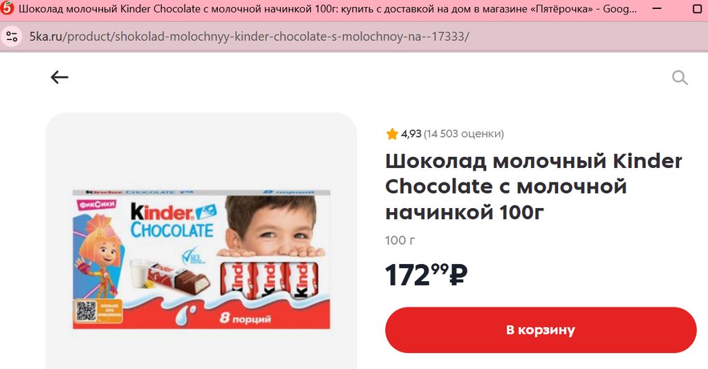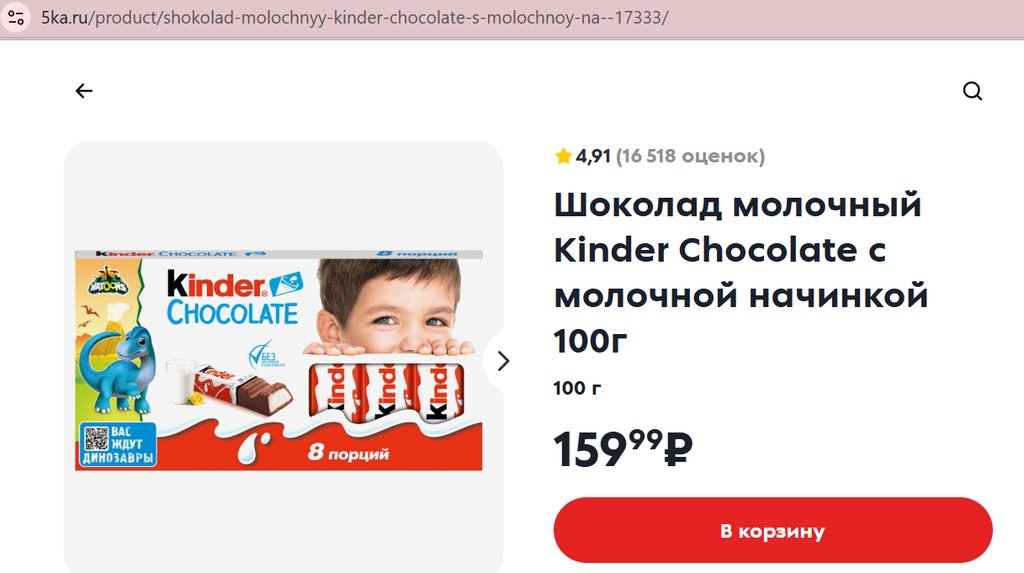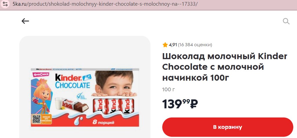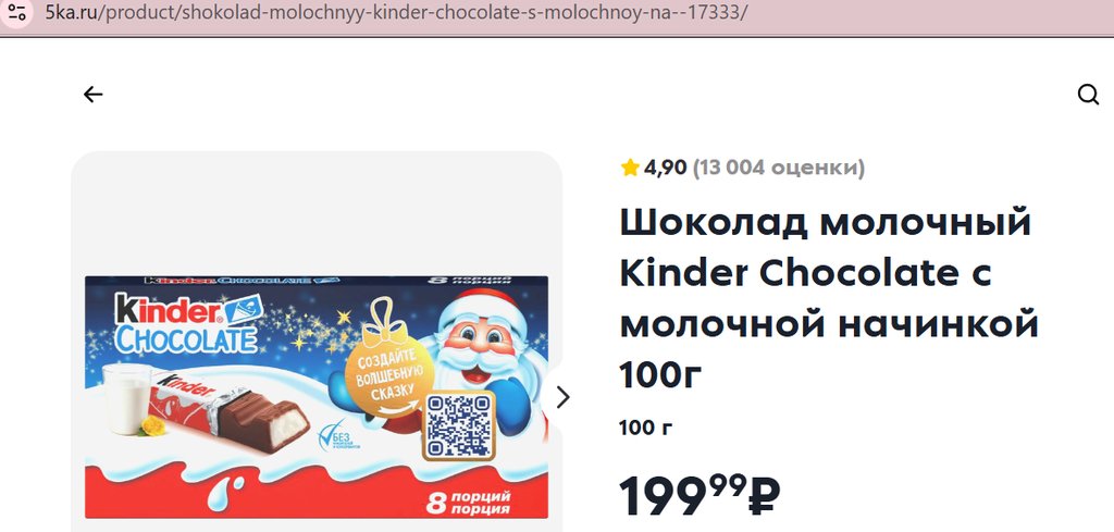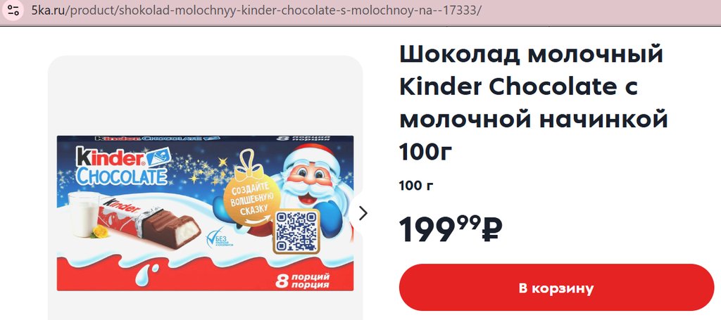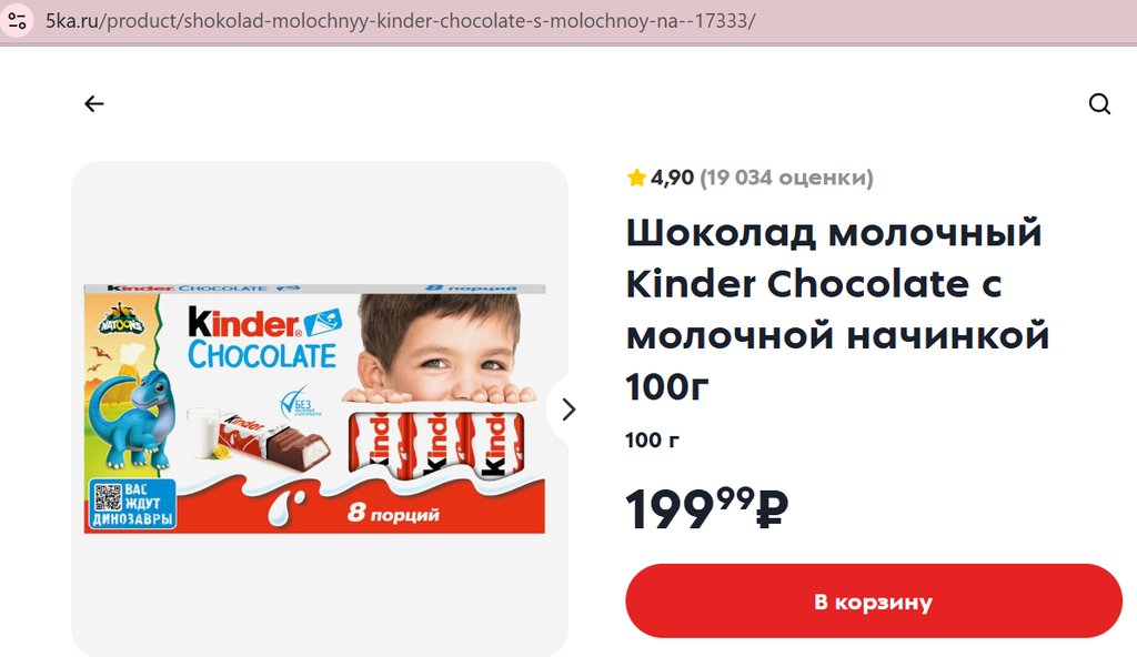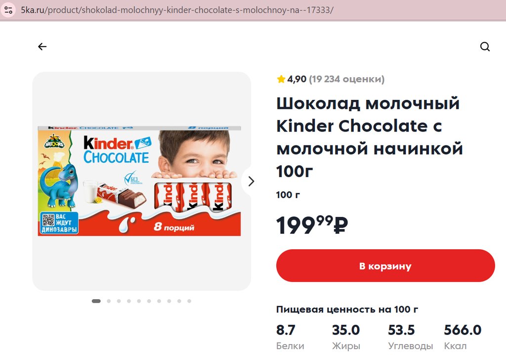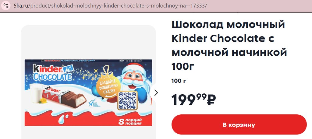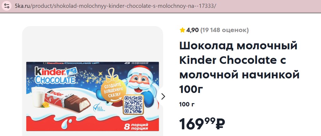 Шоколад Kinder Chocolate с молочной начинкой 100г