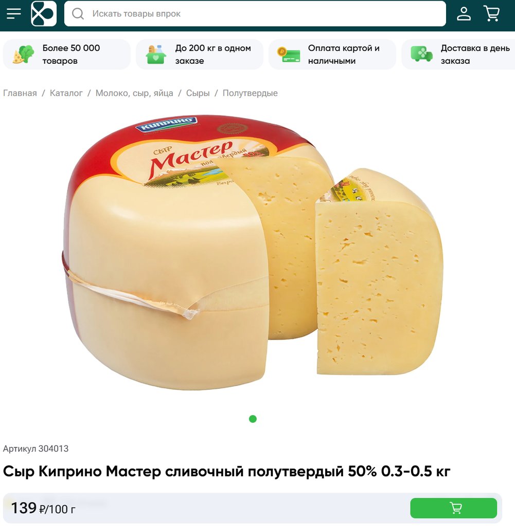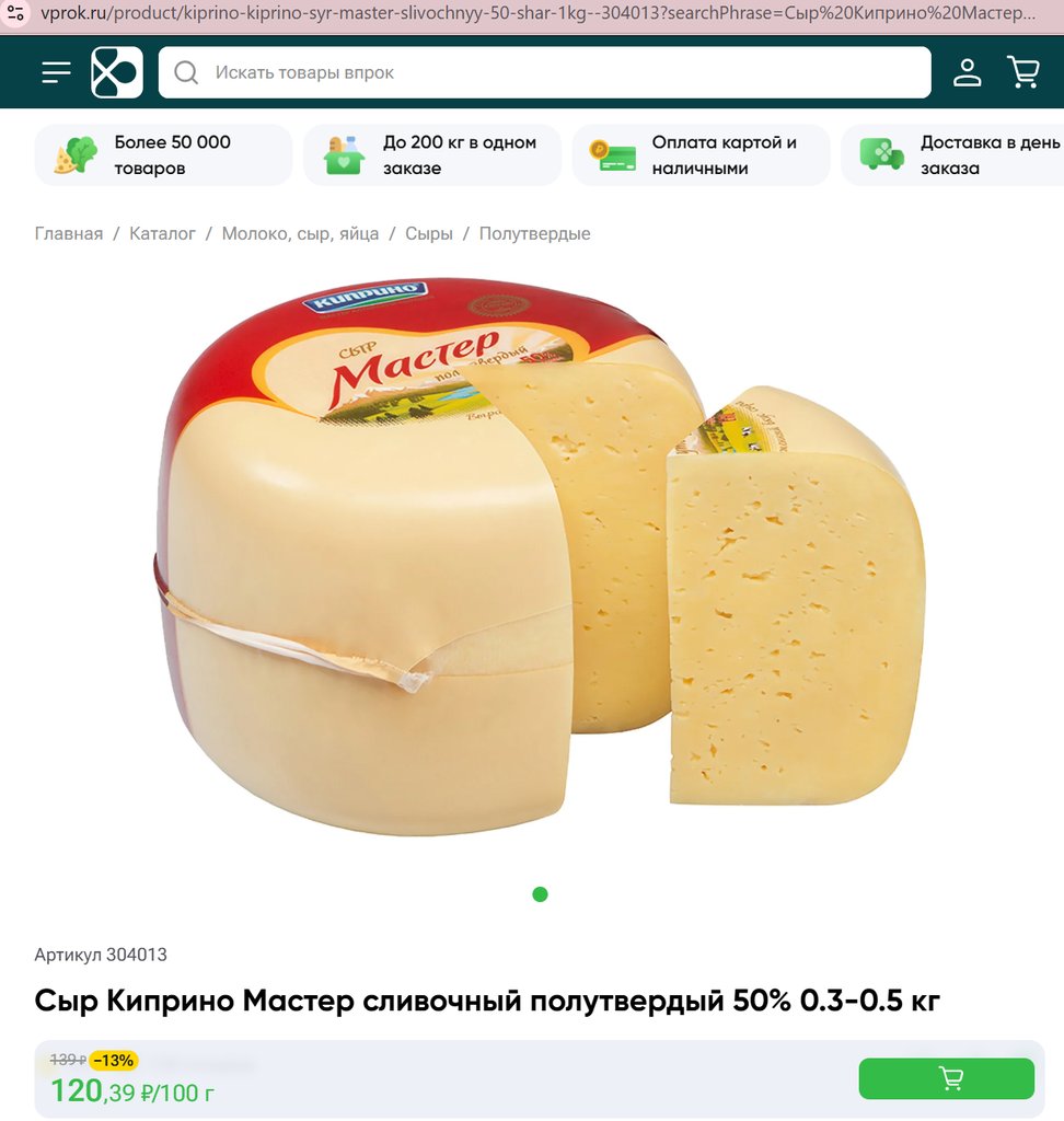 Сыр Киприно Мастер сливочный полутвердый 50% 1кг